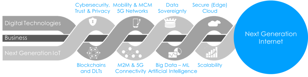 IoT-NGIN introduces novel research and innovation concepts, acting as the “IoT Engine” which will fuel the Next Generation of IoT as a part of the European Next Generation Internet. IoT-NGIN uncovers a patterns based meta-architecture that encompasses evolving, legacy, and future IoT architectures. The project also optimizes IoT/M2M and 5G/MCM communications, including using secure-by-design micro-services to extend the edge cloud paradigm. Moreover, it enables user and self-aware, autonomous IoT systems through privacy-preserving federated ML and ambient intelligence, with AR support for humans. Distributed IoT cybersecurity and privacy, for example, using Self-Sovereign Identities and interconnected DLTs to implement Meta-Level Digital Twins, are also among the main priorities of IoT-NGIN.
