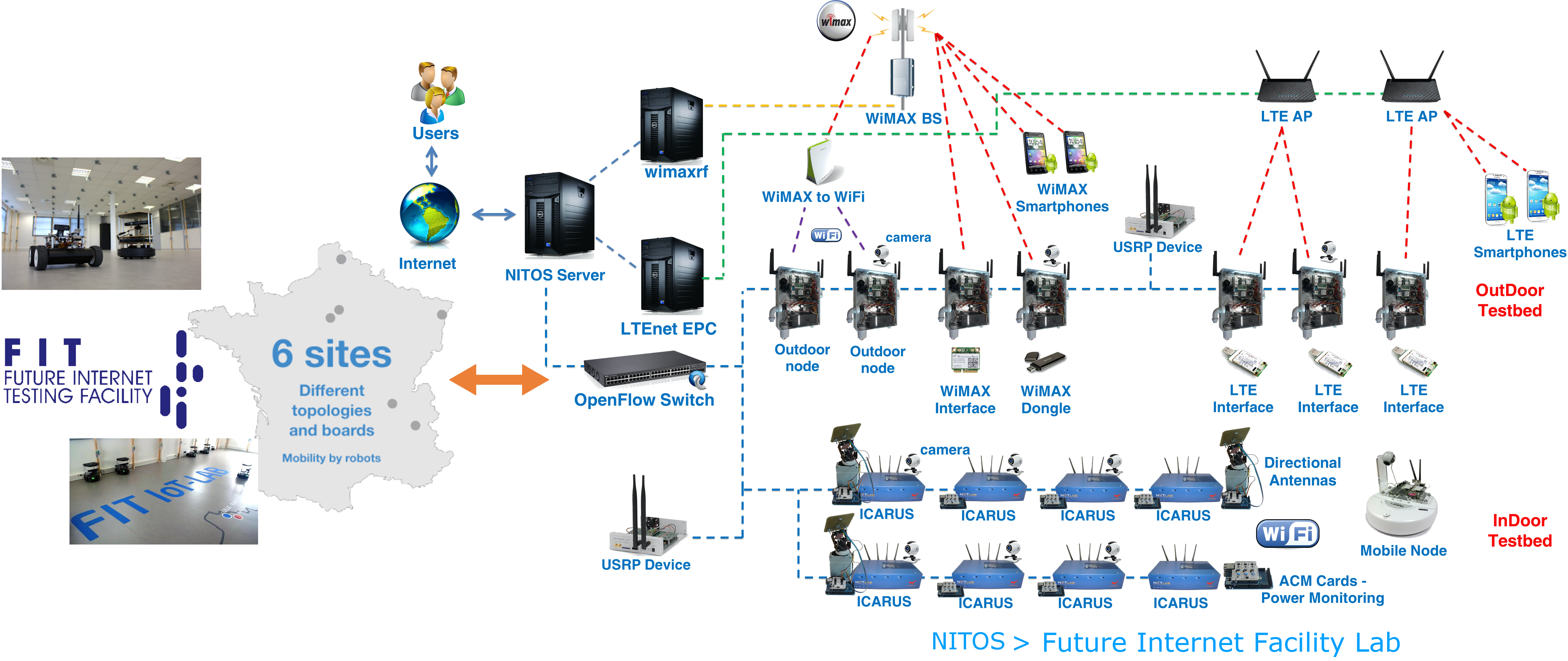 OneLab federates different facilities offering diversity and scale, among which the NITOS and the FIT test platforms. IoT-NGIN will exploit NITOS’ Software Defined Radio (SDR) and Software Defined Networking (SDN) testbeds to test our technologies under diverse scenarios. Moreover, FIT’s very large scale IoT testbed will be exploited to test and validate the IoT-NGIN technologies and applications in a large set of wireless static and mobile IoT nodes with a high variety of sensing capabilities.